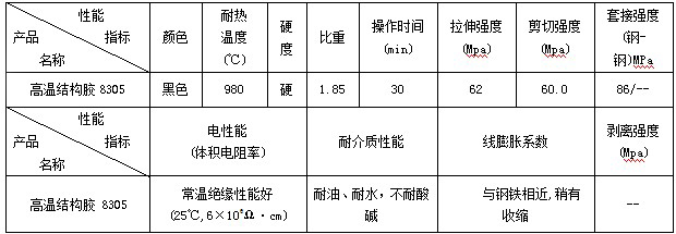 ◆ 高温结构胶SX-8305是双组份,固化物为黑色,耐高温980℃,常温绝缘性好,耐水、耐油、不耐酸碱,套接强度高达60Mpa,与钢有相近的线膨胀系数。